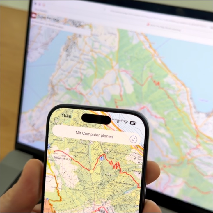 Wählen Sie in dieser Website den Menüeintrag "Routenplaner". Scannen Sie den angezeigten QR-Code mit einem Gerät, auf dem Swiss Pro Map Version 26 oder neuer installiert ist. Die geplante Route wird direkt in der App übernommen.
