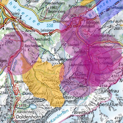 "swisstopo"-Kartenblatt, SAC-Hütten, Wegnetz, Flurnamen, Trinkwasser und Unterstände, sowie vieles mehr, können angezeigt werden.
