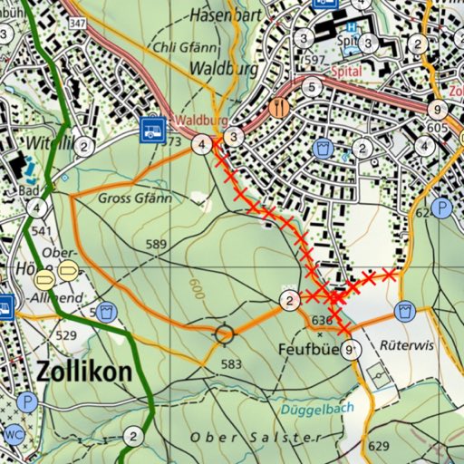 Parkplätze, Wegweiser, Sitzbänke, WCs, Verpflegung, Touristenattraktionen, etc können wahlweise eingeblendet werden.