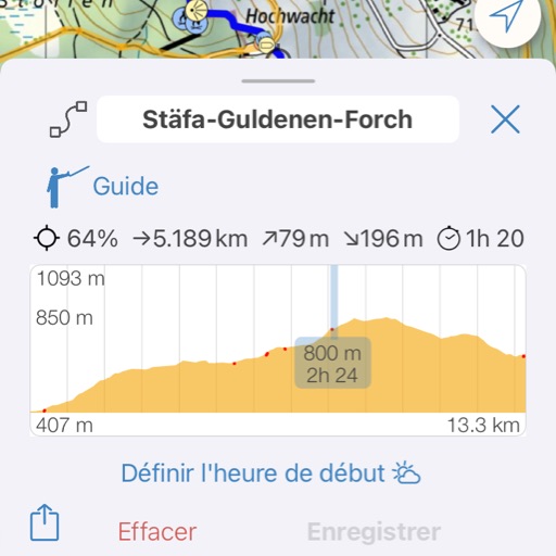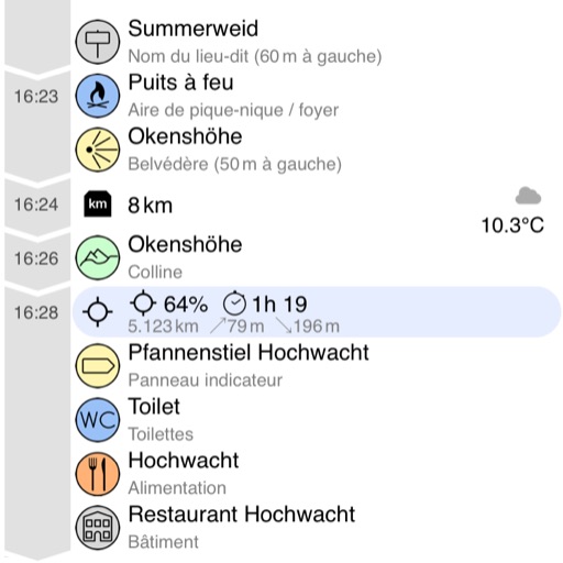 Le guide rassemble les informations pertinentes pour un itinéraire. Non seulement les montées et les descentes, les marqueurs de distance ou le point culminant sont affichés, mais aussi les fontaines à boire, les restaurants, les toilettes publiques, les points d'intérêt et toute une série de choses qui peuvent être intéressantes lors d'une excursion.