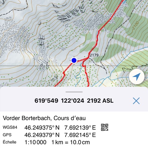 La position actuelle sur la carte est disponible à tout moment, même hors ligne, avec l'indication des coordonnées et de l'altitude.