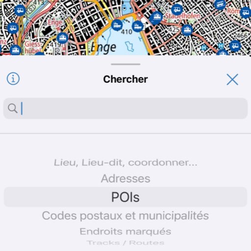 Recherche de noms de lieux et de lieux-dits, de communes, de POI, d'adresses et d'itinéraires SuisseMobile. Tout cela, bien sûr, également hors ligne.