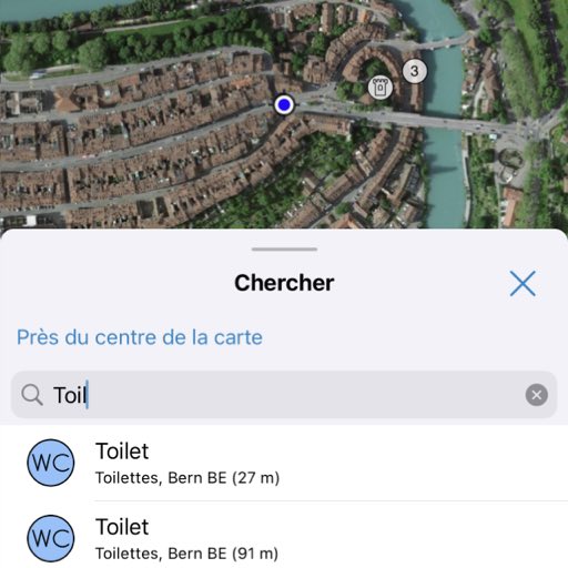 Il est possible de rechercher spécifiquement des objets autour du centre de la carte. Par exemple, les restaurants ou les toilettes publiques.