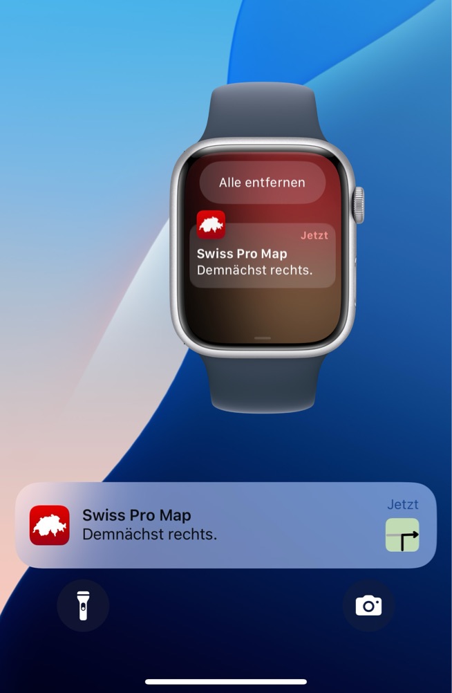 Während Sie unterwegs sind, zeigt Ihnen Swiss Pro Map per Mitteilung auf Ihrem iPhone - und auf Wunsch auch auf Ihrer Apple Watch - an, wo Sie als Nächstes abbiegen sollen, damit Sie auf Ihrer Route bleiben. Ausserdem werden Sie benachrichtigt, wenn Sie die Route verlassen haben.