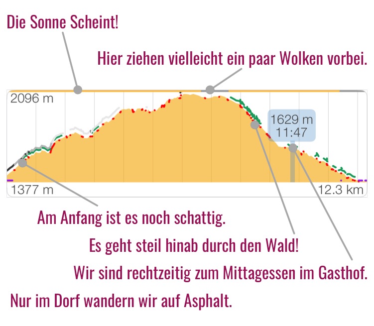 Das Routenprofil verrät Ihnen schon im Voraus, welche Bedingungen Sie auf der Tour erwarten: nicht nur Höhenunterschiede, sondern auch Waldpassagen, steile Stellen und Strecken im Schatten.