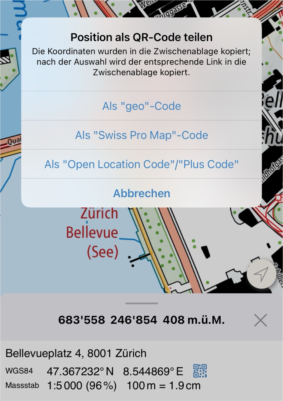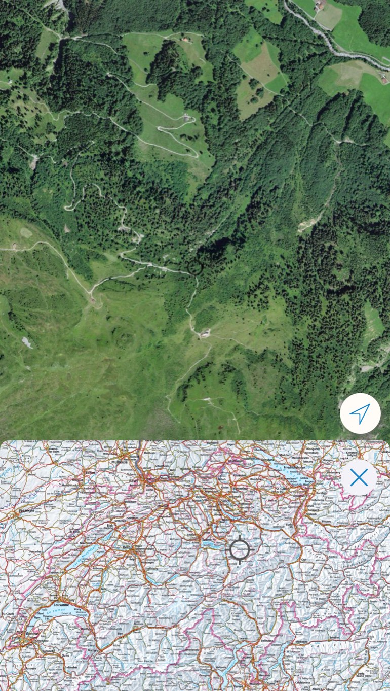 Tippen Sie lange auf den Bildschirm. Wählen Sie Übersichtskarte im Menu. Oder tippen Sie mit drei Fingern gleichzeitig auf die Karte. Eine kleine Schweizerkarte öffnet sich.