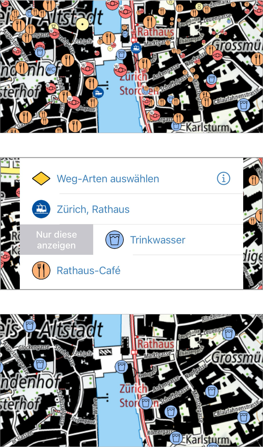 In Gebieten mit vielen POIs kann es passieren, dass man den Überblick verliert. Tippen Sie auf die Karte, erscheint manchmal eine lange Liste von Objekten, die Sie möglicherweise gar nicht sehen möchten. Wenn Sie nur einen bestimmten Typ sehen wollen (zum Beispiel Trinkwasser), wischen Sie einen Eintrag dieses Typs nach rechts.